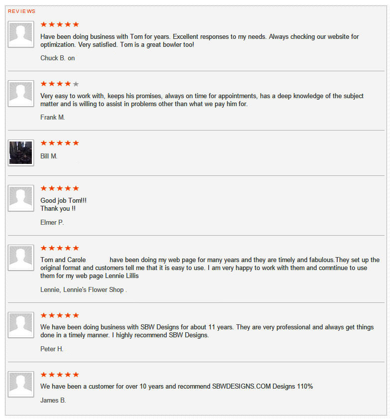 Our company is built on long term relationships, which means that we want to earn your trust and keep it. SBW Designs has been creating and hosting websites for the Small Business Community since 2001.  Managed and owned by Tom Bender since 2001, the most important aspect is quality and service.